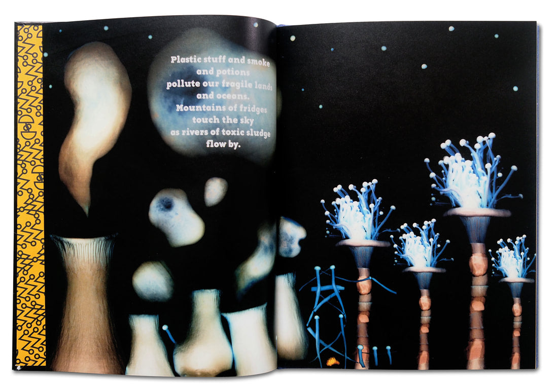 The protagonist of the fungi tale is Penny Bun, whose forest home is under threat from developers who wish to destroy the fragile ecosystem that supports mushroom, plant and human life. The story is told through analogue luminograms which Robinson creates by placing on photographic paper on the plate of an enlarger and exposed to different light intensities. Each exposure produces a unique print, shaped the interplay of light, colour and texture of the mushrooms.